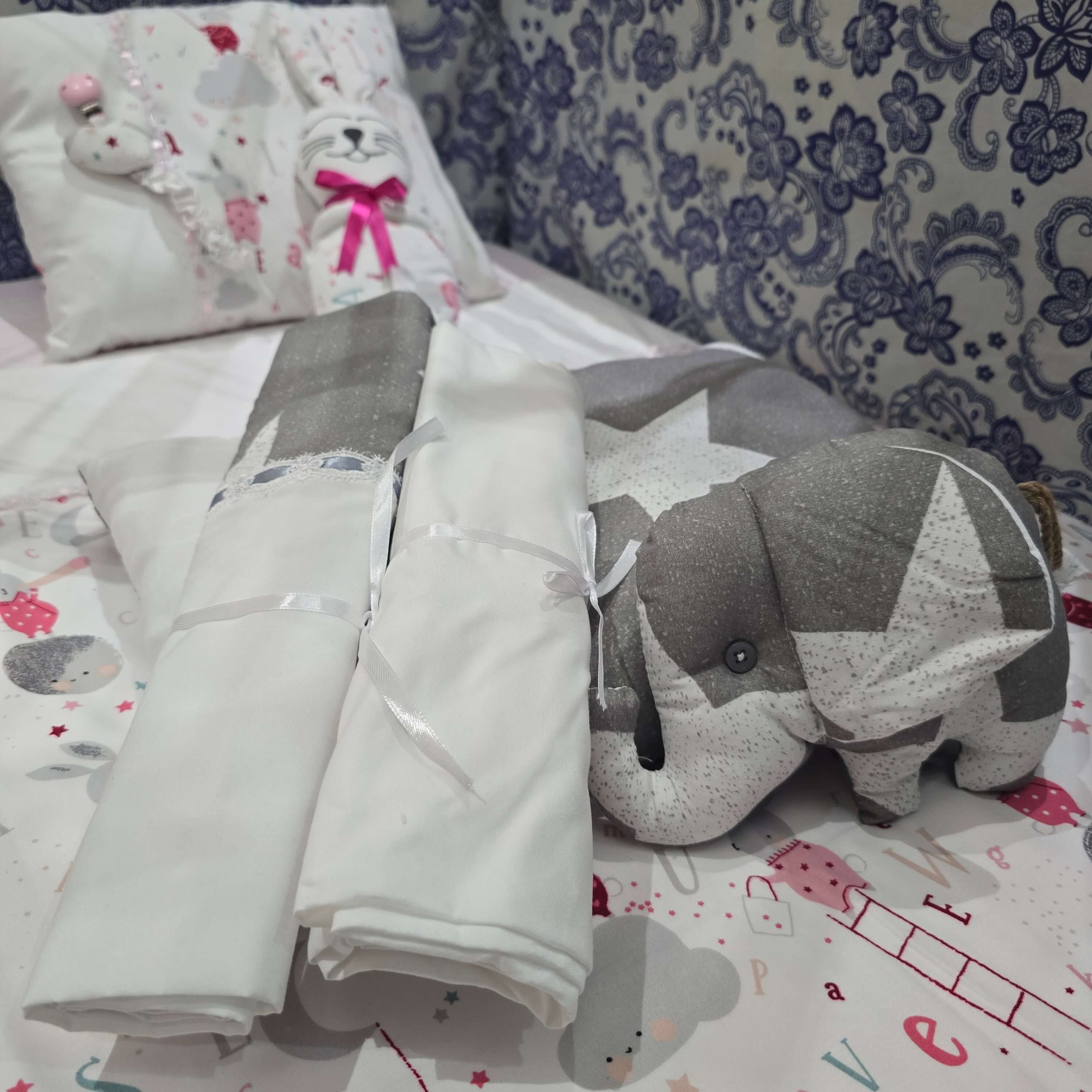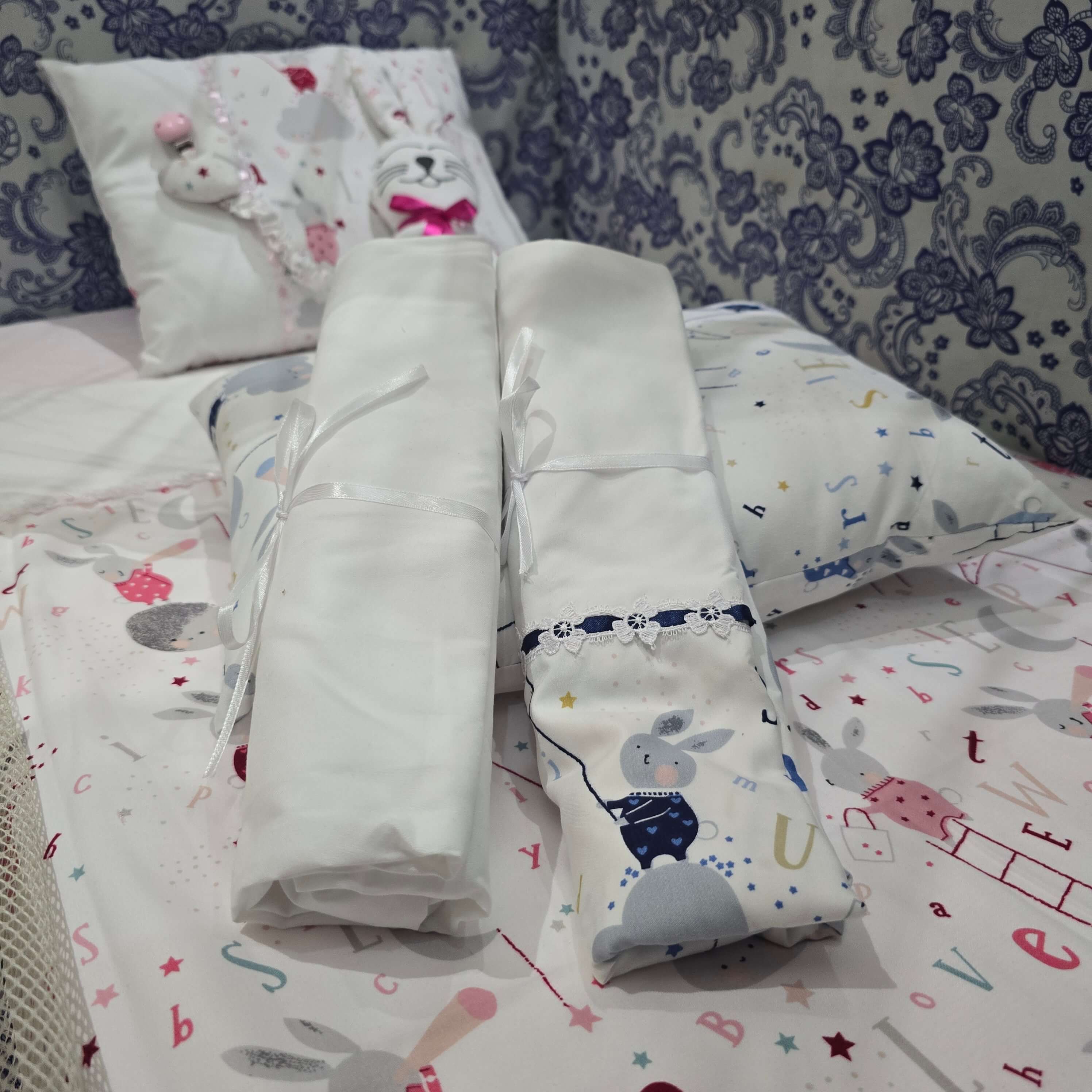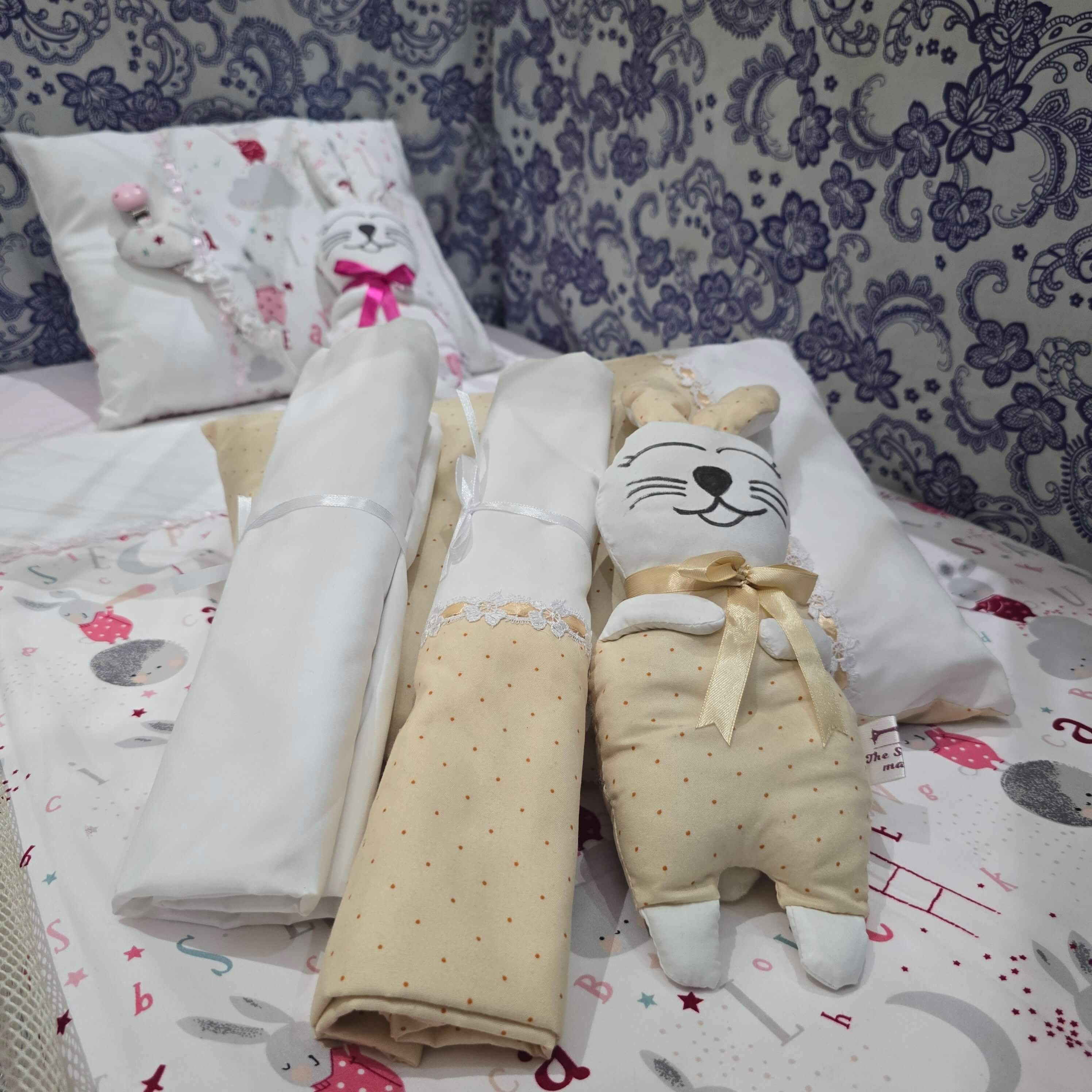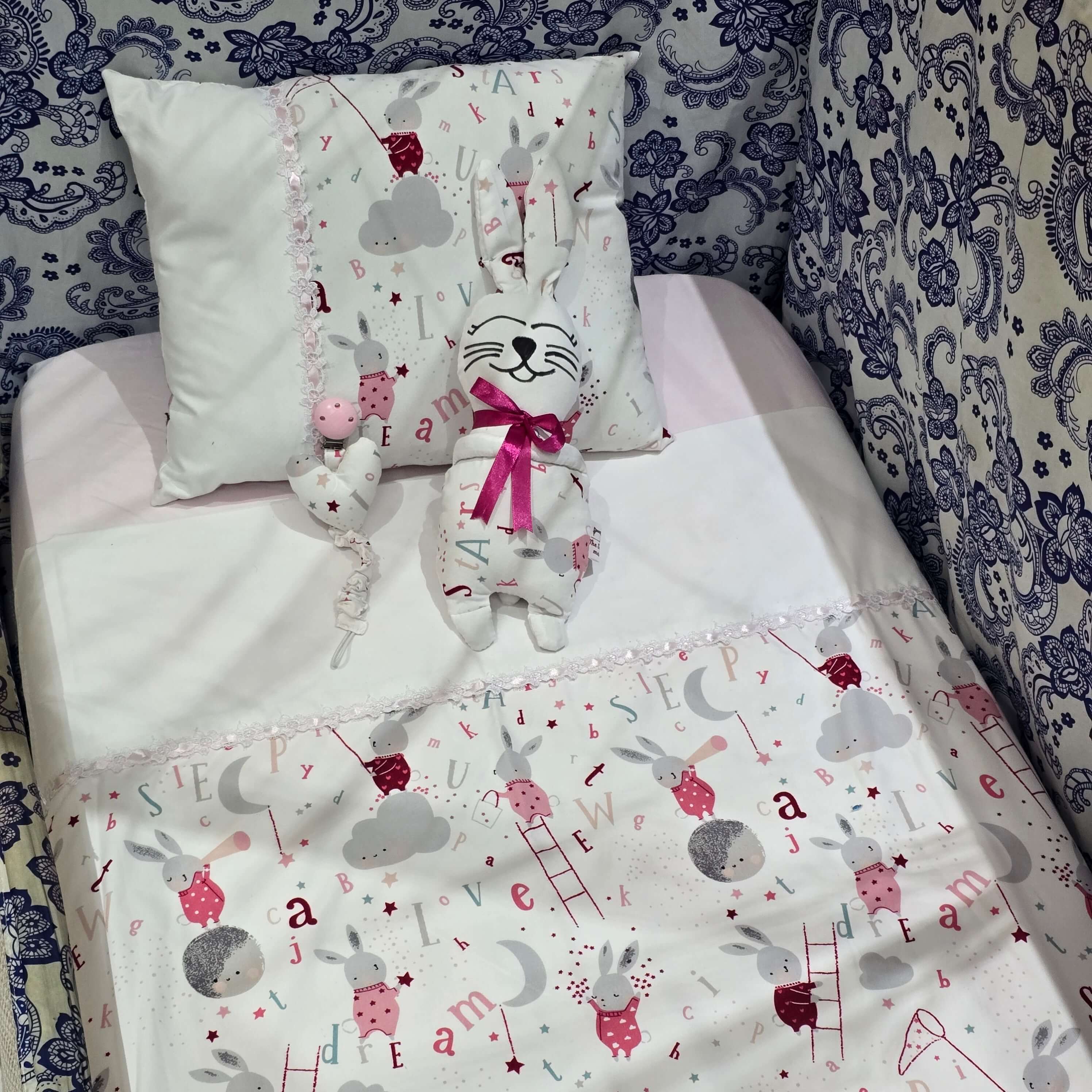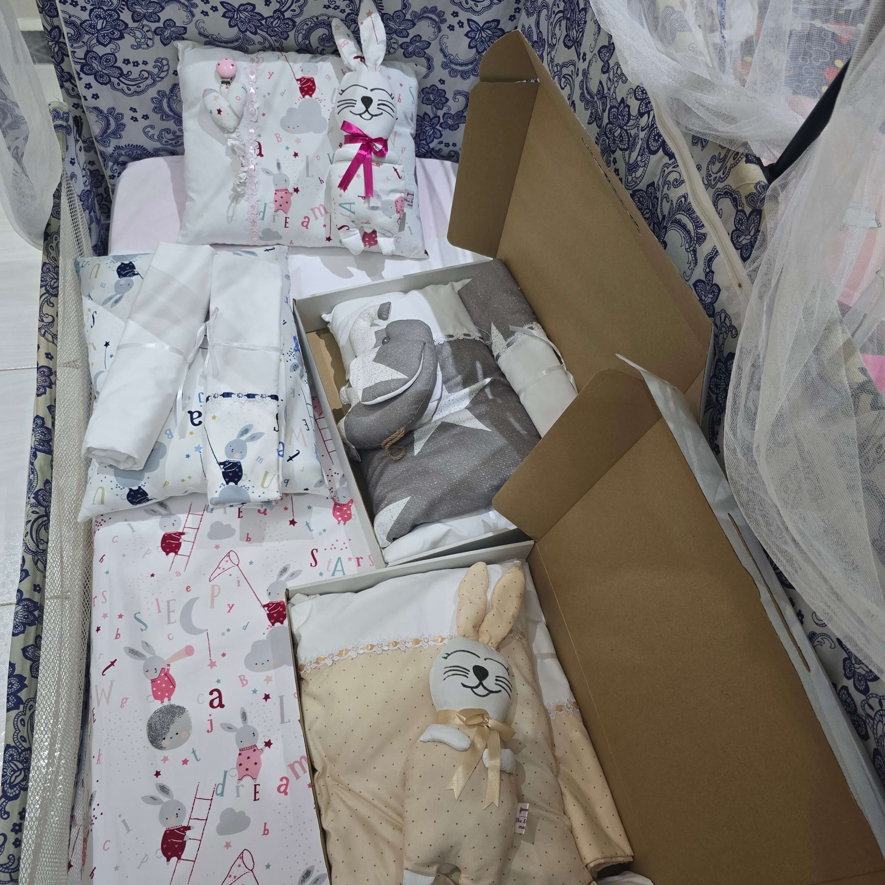 قدملك أجمل طقم كامل خاص بالبيبي فيه كلش ضروري: مخدة صغيرة مريحة، مريلة قطنية عملية، لعبـة أرنب قطنية آمنة، شرشف ناعم، وملحقات تزيد لمسة كيوت